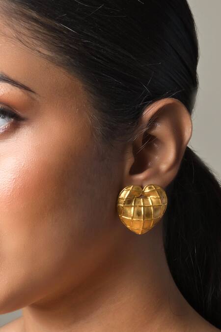 Gold plated stud earrings featuring a heart pattern with checkered detail