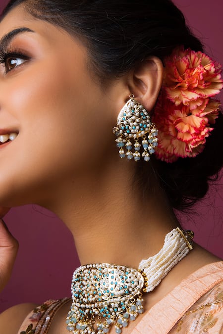 Blue Pearls, Diamonds, Stones Jadau Embellished Choker Necklace Set