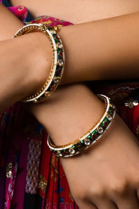 Green Stones, Metallic Thread, Beads Meenakari Floral Kundan Bangle-Set of 2