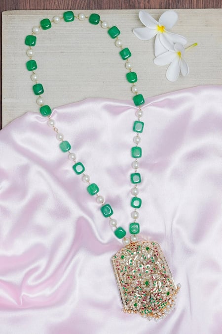 Gold plated geometric carved pendant necklace featuring green pearl and multicolor jadau stone embellishments