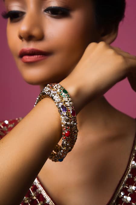 Gold plated bangles featuring navratna and pearls embellishments. Set includes two intricately designed bangles with a double lock closure.