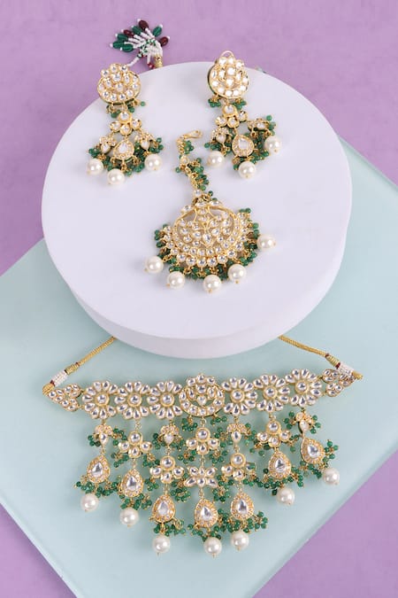 Royal green layered kundan choker set featuring a choker, earrings, and maangtikka. The set is crafted from brass with gold plating and embellished with pearls and green stones.