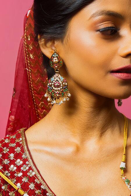 Gold plated pendant with navratna embellishments, Matching earrings with pearl detailing