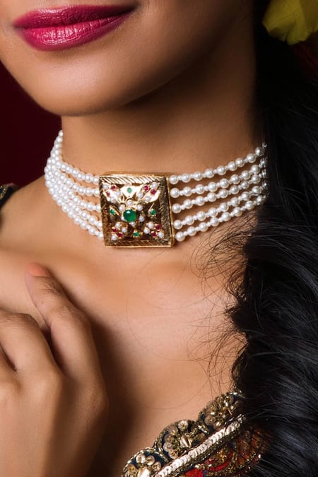 Square carved design with intricate detailing, Navratan stones in vibrant colors, Multiple strands of pearl-like beads