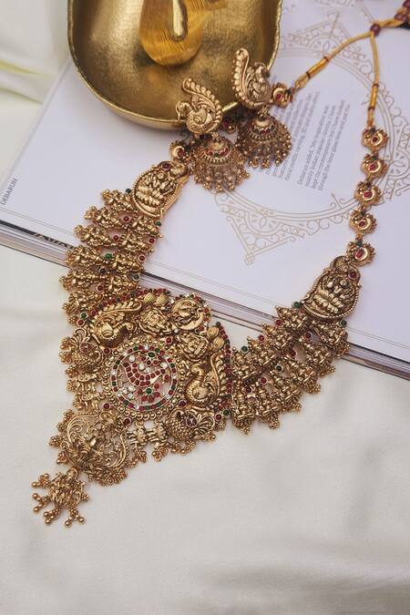 Gold temple carved necklace featuring intricate peacock motifs and stone embellishments. Paired with matching jhumka earrings adorned with ghungroo drops.