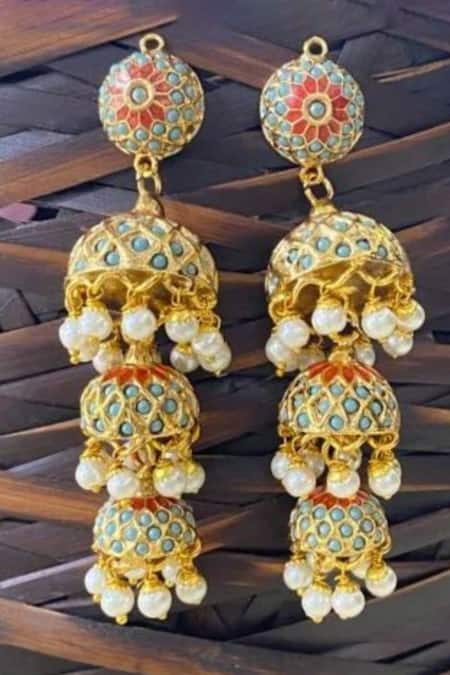 Gold toned three layered jhumkas featuring blue stones and pearl embellishments