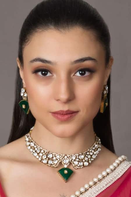 White and green stone embellished collar choker featuring an adjustable dori closure. Paired with matching earrings that have a push back clasp.