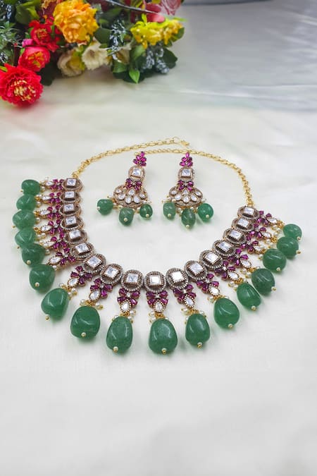 Multi-color necklace featuring Kundan stones and beryl stone drops. Paired with matching earrings designed in a Victorian style.