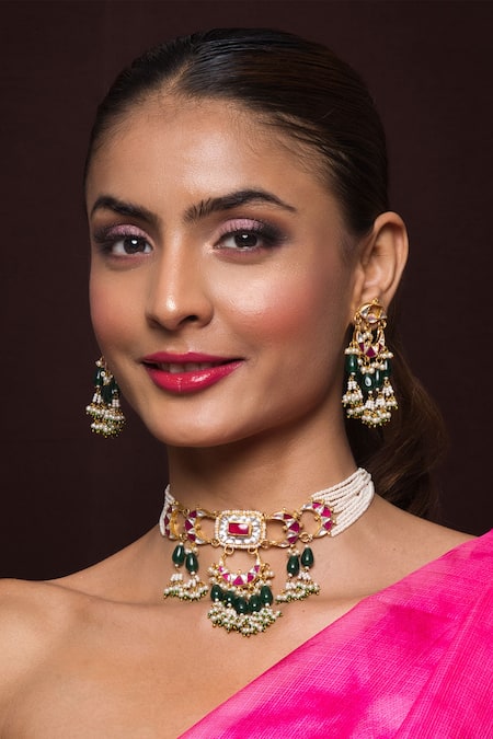 Gold plated choker necklace featuring kundan and pearls embellishments. Paired with matching earrings designed with intricate detailing.