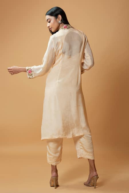 Buy_Quench A Thirst_Beige Chinnon, Modal Silk Floral, Paisley Jacket Open, With Embroidered _Online_at_Aza_Fashions