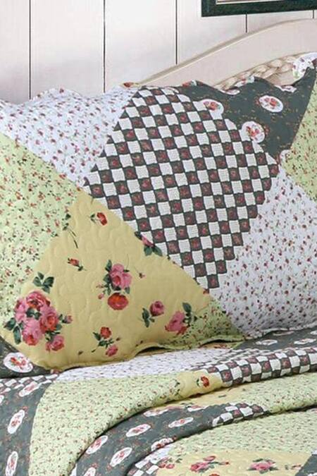 Multi color quilt with all over floral chequered pattern. Comes along with matching set of 2 pillow covers.