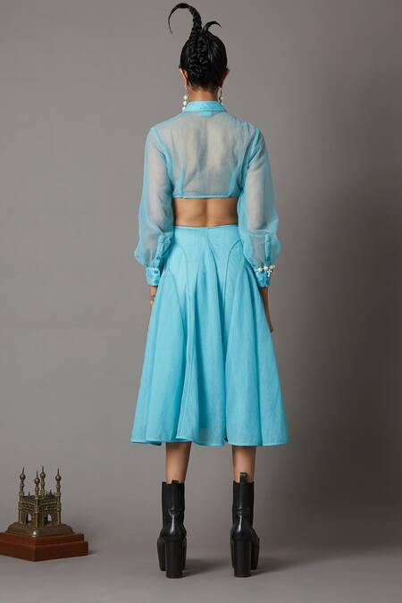 Powder blue mesh dress featuring pleats in the front, side cutouts, and a layered bottom half with tapework detailing