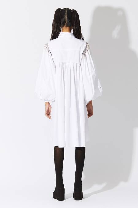 Figurine print design on front panel, Balloon sleeves for a dramatic effect, Collar neckline for a polished look