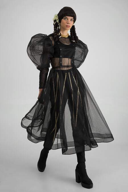 Black midi dress featuring wolf wing sleeves and a bib placket in front