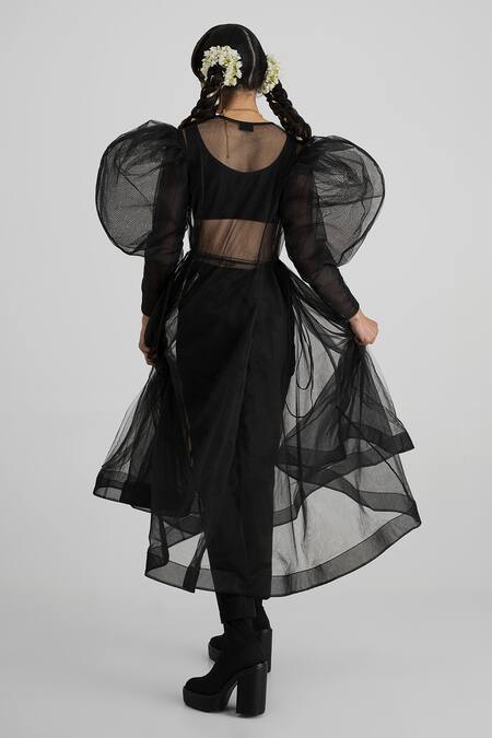 Black 100% Nylon Plain Round Wolf Wing Equinox Sleeve Dress