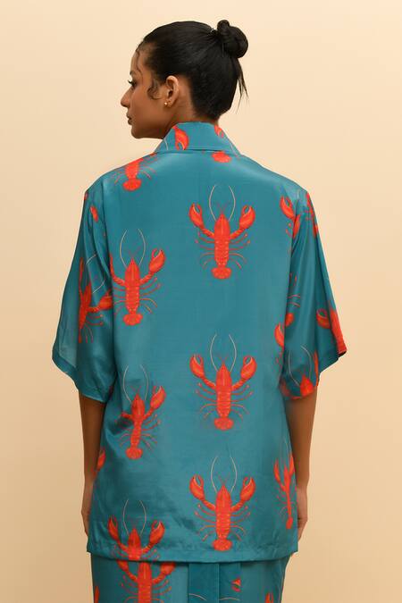 Blue Crepe Collared Lobster Print Shirt And Draped Skirt Set