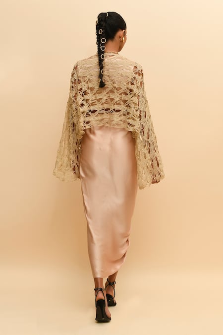 Beige solid draped dress featuring ring detailing on the waistband. Paired with a mesh tee overlay for added style.