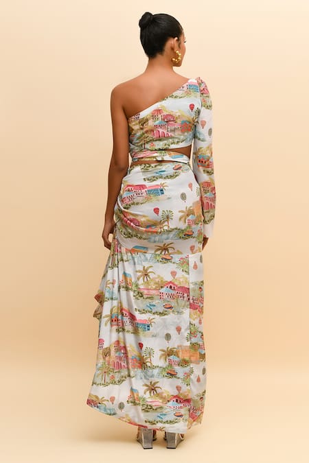 Multi Color Crepe Buckles One Shoulder Cityscape Print Maxi Dress