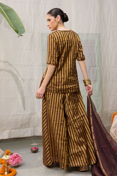 Brown Chanderi Zari V-neck Amala Stripe Pattern Tunic With Wide Legged Pant