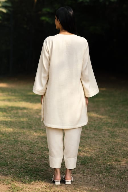Cream Wool Round Neck Solid Kurta Set With Stole