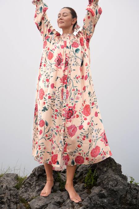 Floral kyaari print design, High round neckline, Relaxed fit with flared silhouette