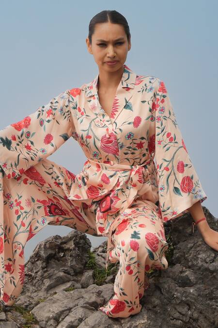 White and red kyaari print top featuring a lapel collar and long flared sleeves. Comes with a matching belt for added style.