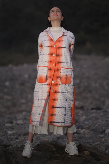 White and orange handwoven cotton quilted trench coat featuring a tie-dye pattern and side pockets