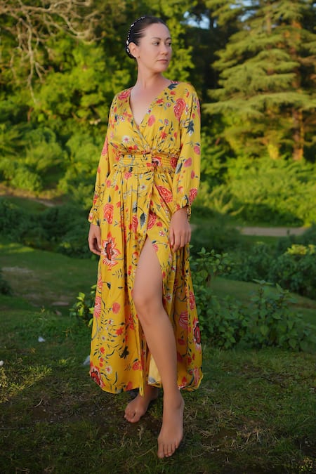 Yellow Velvet Embroidery V-neck Kali Printed Maxi Dress