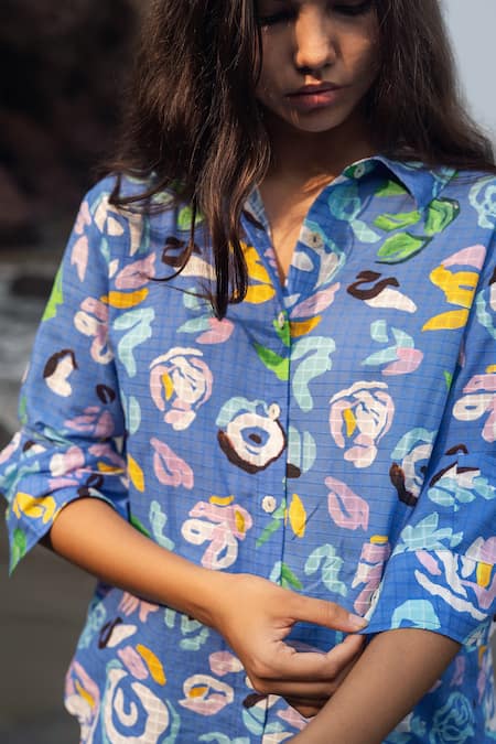 Multi blue cotton slub checks set featuring a relaxed fit shirt and shorts. Made from hand-painted print fabric, perfect for casual outings.
