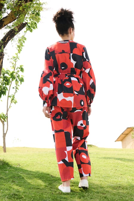 Red Pixel Mekko print top featuring full sleeves and a V neckline. Paired with coordinating relaxed fit pants.
