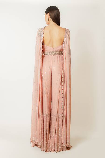 Blush pink georgette blouse featuring high neck and flared sleeves with sequins, thread & zari embroidery. Paired with box-pleated palazzo pants.