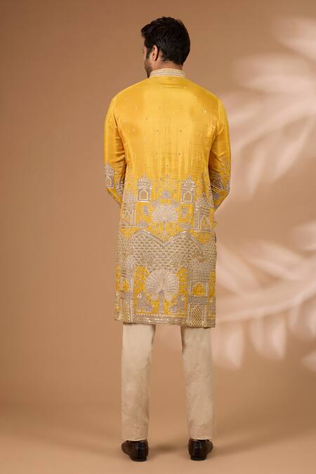 Haldi yellow kurta featuring intricate zari, sequin, and print work all over. Paired with gold cotton silk pant.