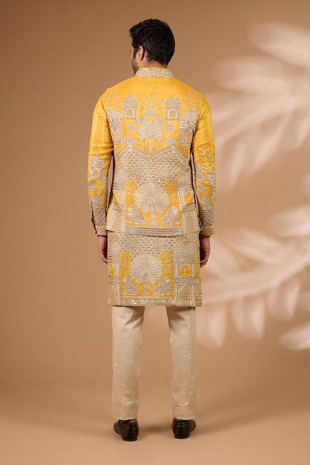 Yellow Silk Zari, Sequins Architecture Print Bundi