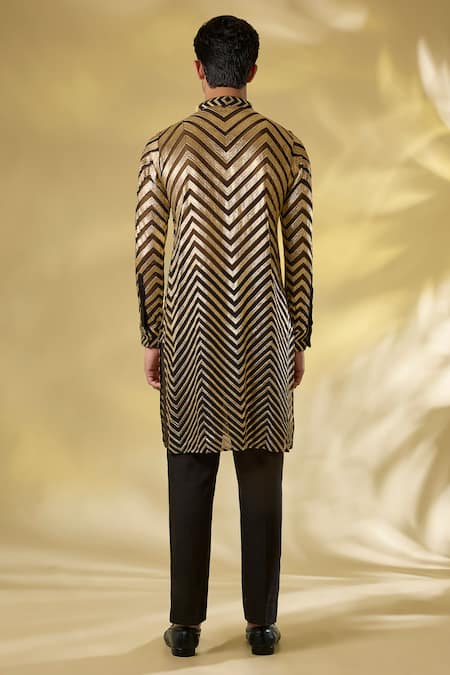 Black kurta featuring gota work in chevron patterns. Paired with matching black pant.