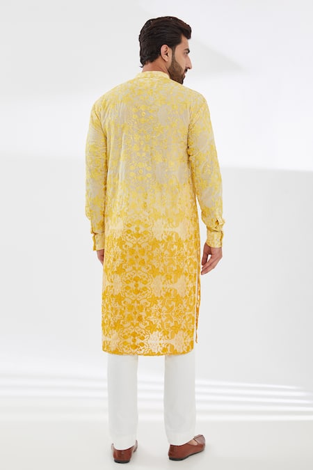 Yellow ombre kurta in georgette featuring all over bloom jaal resham embroidery. Paired with a cotton silk trouser for a complete look.