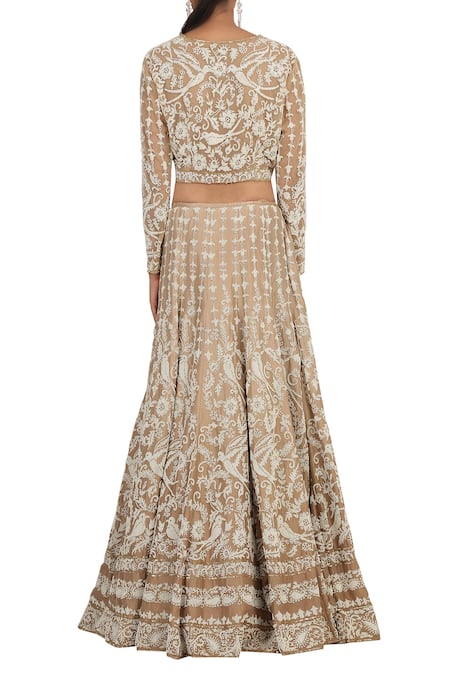 Beige lehenga with bird & floral motif pearl embellishment. Paired with matching blouse & dupatta.