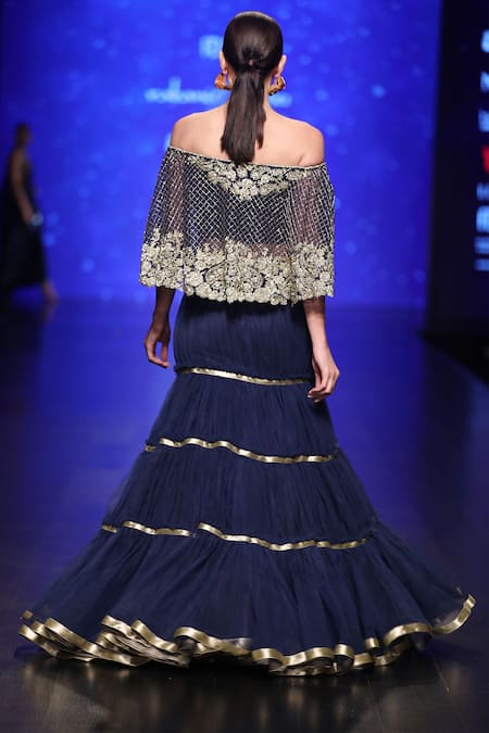 Midnight blue lehenga with net layers. Paired along with blue embellished sequin cape in an off-shoulder style. It comes along with a silk bustier.