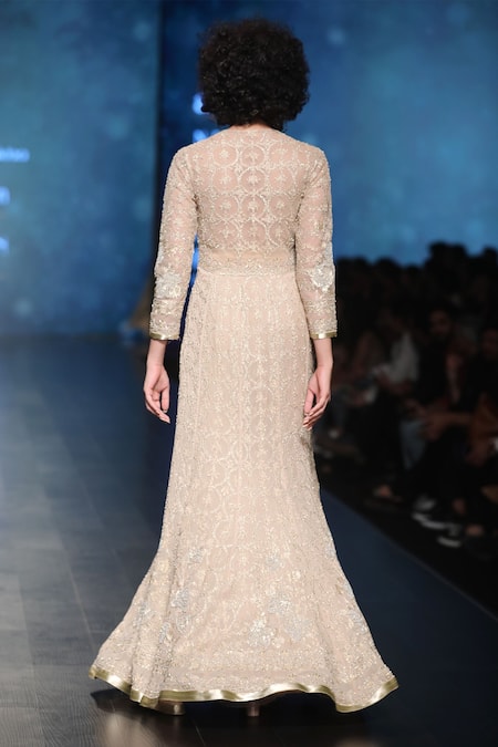 This pale gold embroidered anarkali style gown embodies the fine art and romance in dress-making! It is finely accentuated with kasab embellishments in shimmering sequins and beads. Team up with long dangling earrings and a pair of gold peep-toe heels for a glam look.