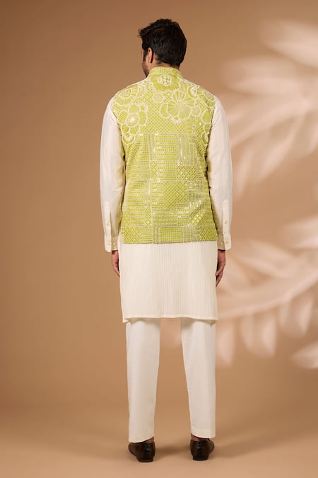 Lime green bundi featuring full front and back embellishments with sequins, beads, and thread. Paired with an off-white pintuck cotton silk kurta and pant.