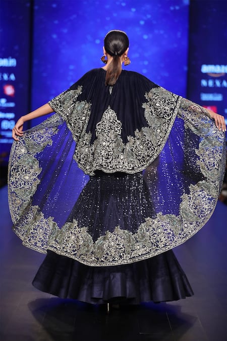 Buy_Rabani & Rakha_Blue Velvet, Mesh, Dupion Silk Sequin, Bead Embroidered Cape And Lehenga Skirt _at_Aza_Fashions