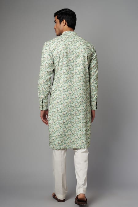 Ivory green kurta featuring a band collar and long sleeves with sequin work. Paired with matching pants for a complete look.