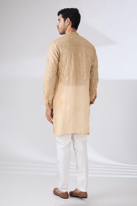 Gold georgette kurta featuring silver thread and sequin embroidery. Paired with matching pants.