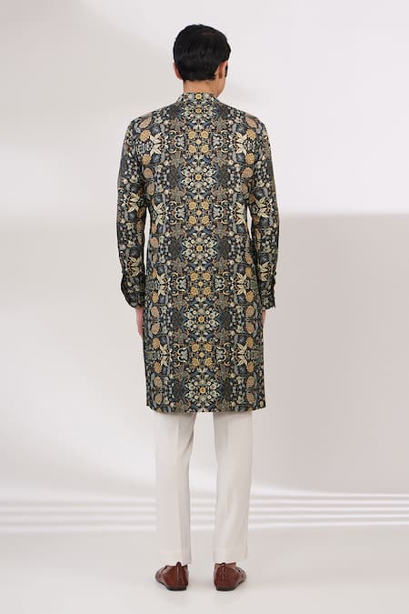 Black georgette kurta featuring a floral print and mandarin collar. Paired with a cotton silk pant for a complete set.