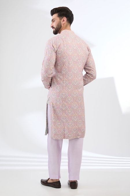 Pink silk kurta featuring a floral print with thread and beaded embroidery. Paired with a lilac pant for a coordinated look.