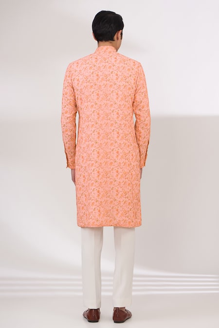 Peach kurta featuring floral print with sequins embroidery and a mandarin collar. Paired with cotton silk pants for a complete look.