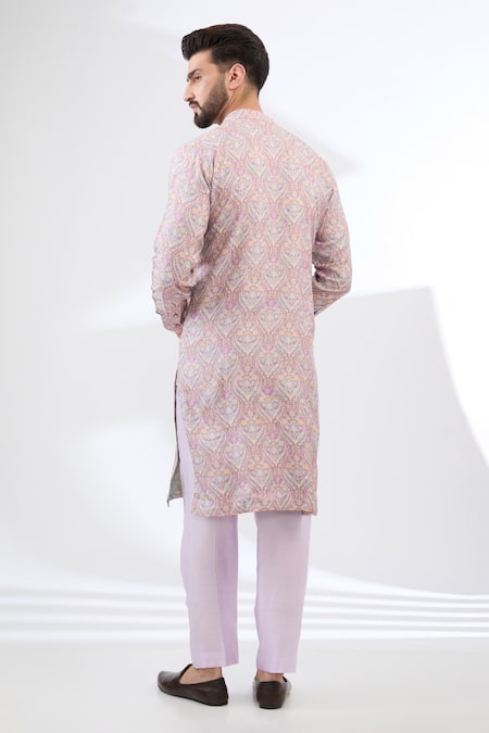 Pink dola silk kurta featuring floral print with thread and beaded embroidery. Paired with a lilac pant for a coordinated look.