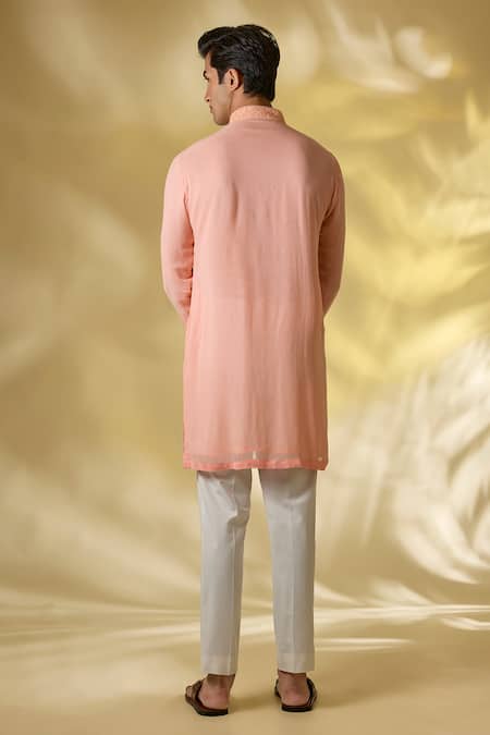 Pale peach kurta featuring intricate thread and sequin work. Paired with matching pale peach pants.