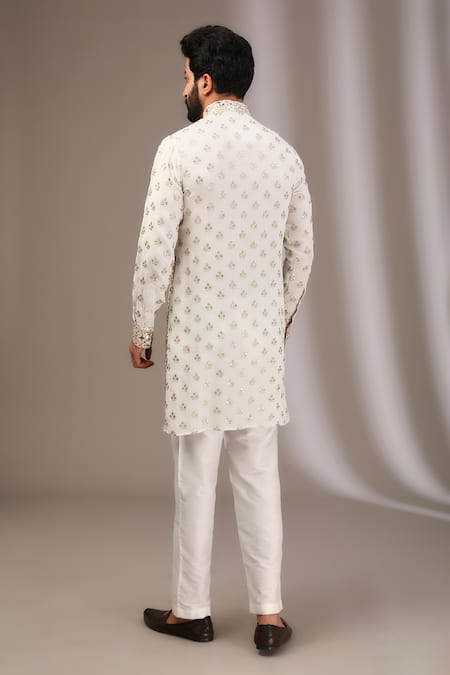 Ivory kurta featuring mirror and sequin embroidery all over. Paired with a solid pant in cotton silk.
