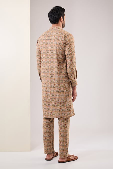 Gold kurta featuring Mughal print all over with a band collar and full sleeves. Paired with coordinating printed pants for a complete look.
