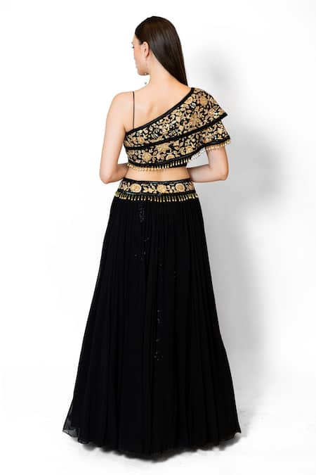 Black lehenga featuring sequin embroidery with a gold zari embroidered waistband. Paired with an asymmetric two-tiered cape blouse adorned with floral zari embroidery.